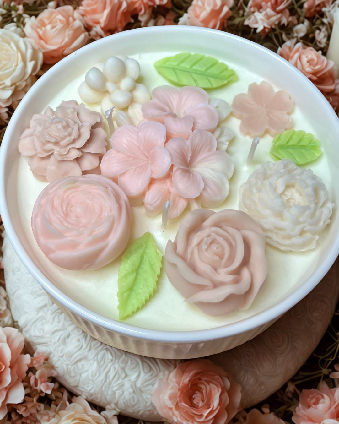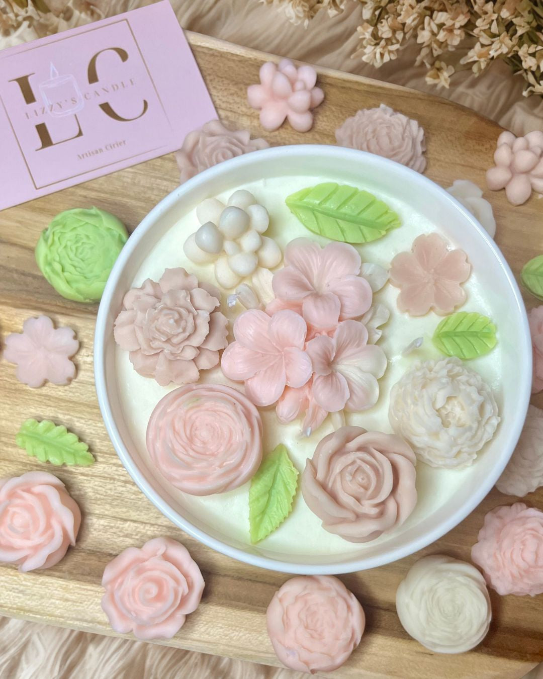 Découvrez une création florale unique, entièrement réalisée à la main dans un format généreux, décorée de fleurs moulées une à une pour un rendu raffiné et poétique.